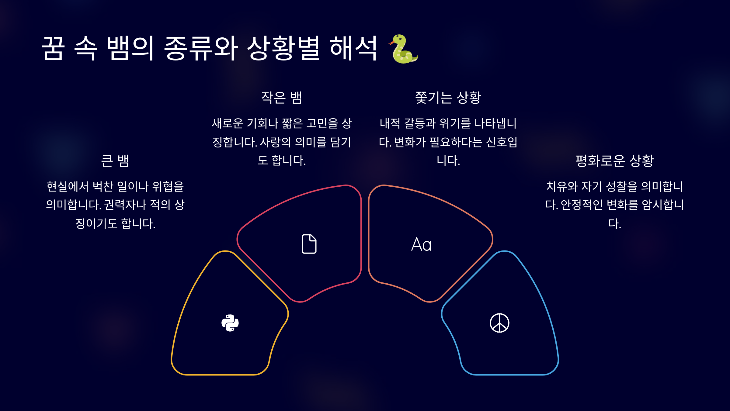 이런 해석을 통해 꿈을 단순히 지나가는 현상이 아니라, 내면을 들여다보는 중요한 단서로 삼을 수 있어요. 뱀이 무섭게 느껴졌다면, 그 감정은 현실에서 무언가가 나를 압박하고 있다는 걸 알려주는 신호일 수 있어요.