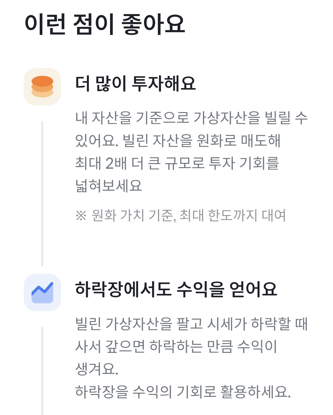 하락장 활용: 특정 코인 가격이 떨어질 것 같을 때, 코인을 빌려 팔고 가격이 하락하면 다시 사서 갚아 시세 차익을 얻을 수 있어요. 📉➡️📈