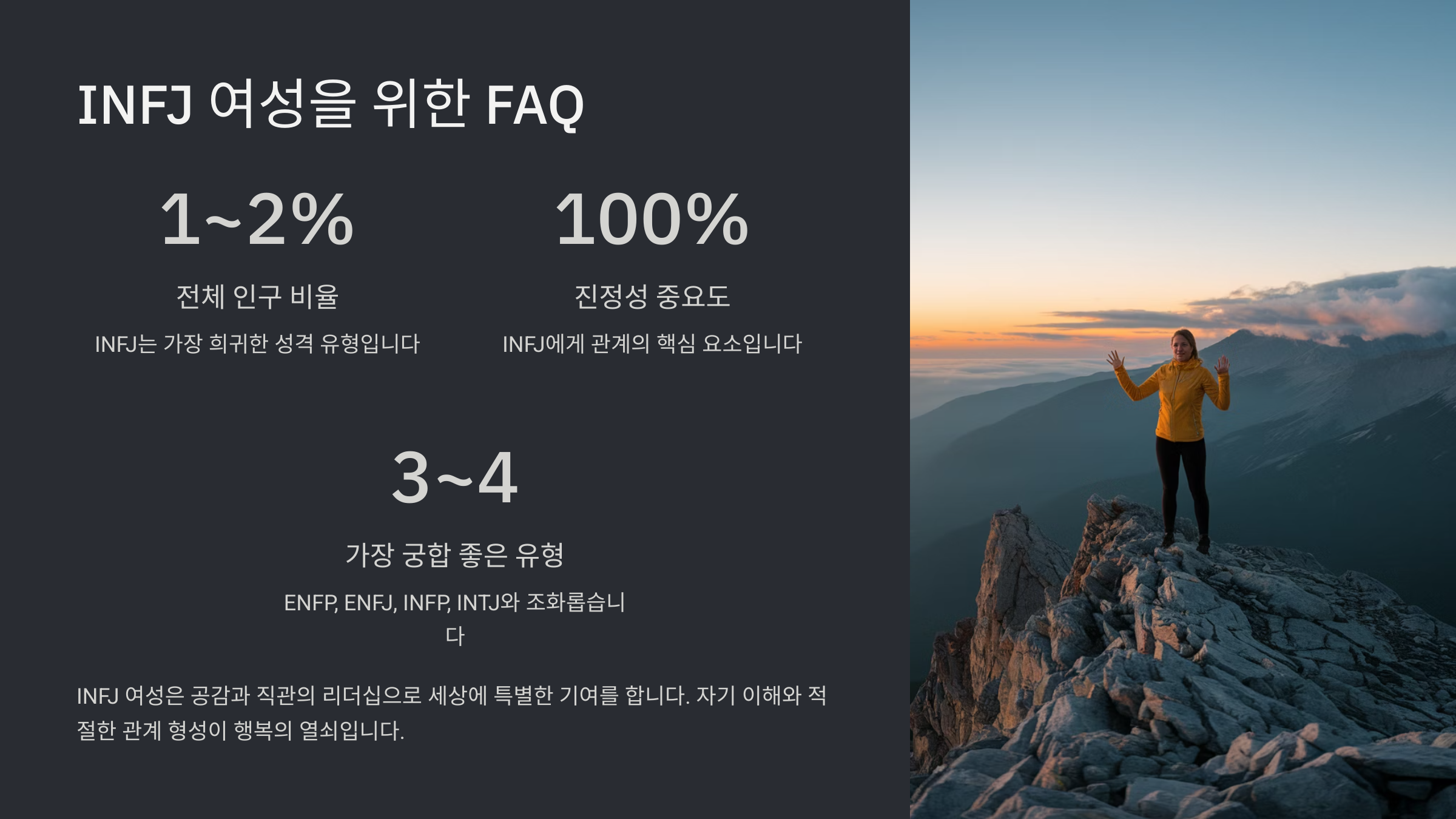 이제부터는 INFJ 여자의 성격부터 연애 스타일, 잘 맞는 궁합과 성장 팁까지 하나씩 자세히 알아볼게요. 제가 생각했을 때 INFJ는 가장 섬세하면서도 강한 내면을 가진 사람들이라, 이해하면 할수록 매력이 깊어지는 유형이에요 🍀