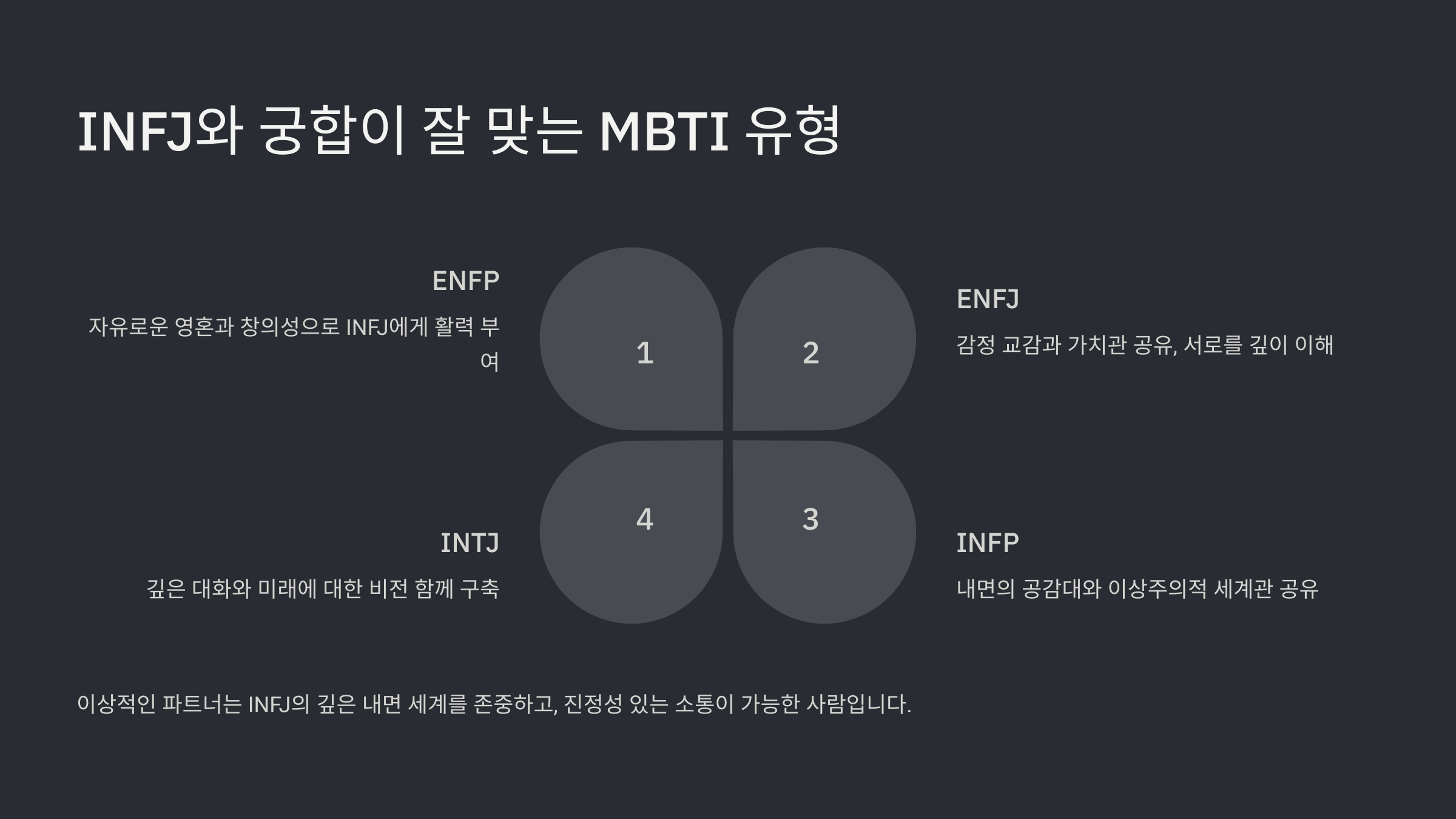 | ENFP | INFJ의 감정선을 존중하고 유쾌하게 이끌어줌 | 자유롭고 따뜻한 분위기 |