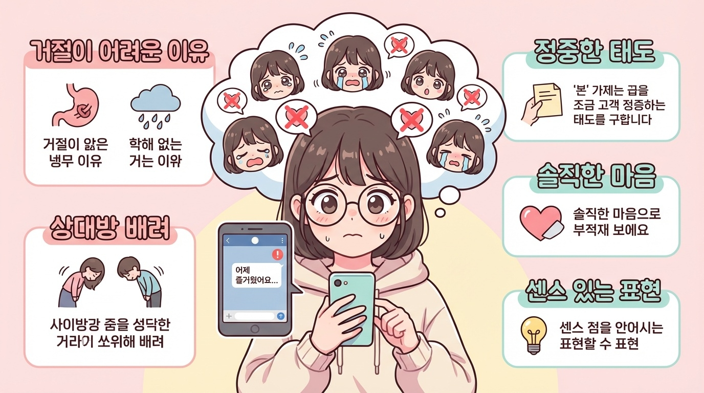 특히 잠수를 타는 것은 최악의 방법입니다. 상대방은 내가 바쁜 건지, 거절하는 건지 알 수 없어서 계속 마음을 졸이게 됩니다. 용기를 내서 짧게라도 거절 의사를 전달하는 것이 서로를 위한 배려입니다. 💪