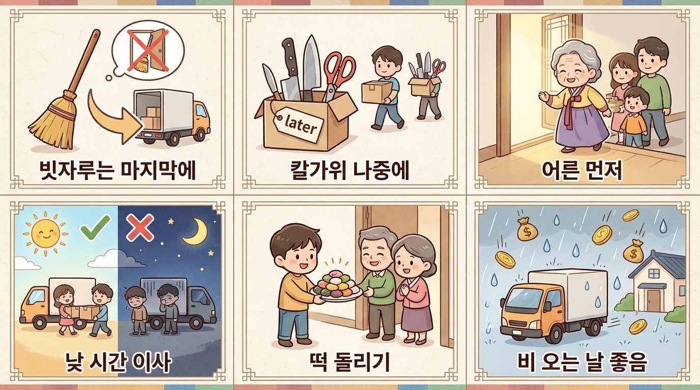 | 밤 이사 피하기 | 해가 진 후 이사하면 귀신이 따라 들어온다는 속설이 있어 낮 시간 이사를 권장합니다. |