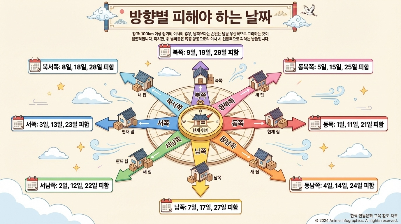 | 이사 방향 | 피해야 하는 날짜(음력 기준) |
