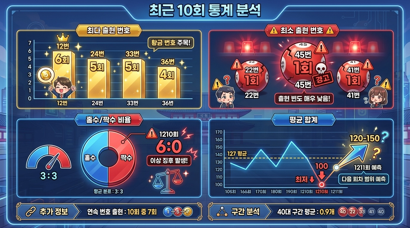 로또 번호 예측에서 가장 중요한 것은 최근 출현 통계입니다. 1210회의 올홀수 출현은 매우 이례적인 현상으로 역대 1200회 이상 추첨 중 올홀수 조합은 단 10회 미만에 불과합니다. 📊