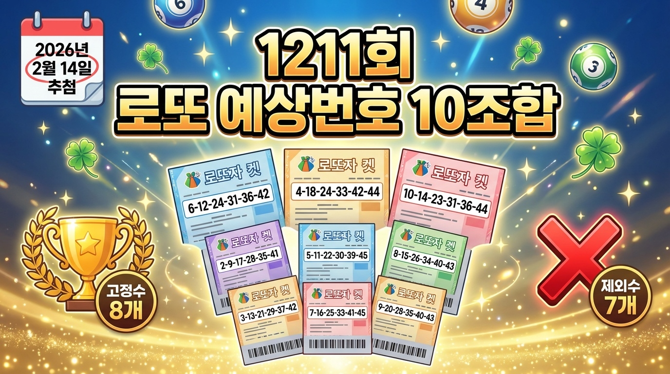 2026년 2월 14일 추첨 예정인 제1211회 로또 당첨번호를 미리 예측해보세요! 지난 1210회 당첨번호 1, 7, 9, 17, 27, 39와 보너스번호 31의 패턴을 분석하고 최근 10회 차 통계를 바탕으로 고정수와 제외수를 선정했습니다. 홀짝 비율, 번호대 분포, AC값, 합계 범위까지 다양한 분석 기법을 활용해 엄선한 10조합을 공개합니다. 행운의 번호를 찾아 1211회 로또에 도전해보시기 바랍니다! 🍀