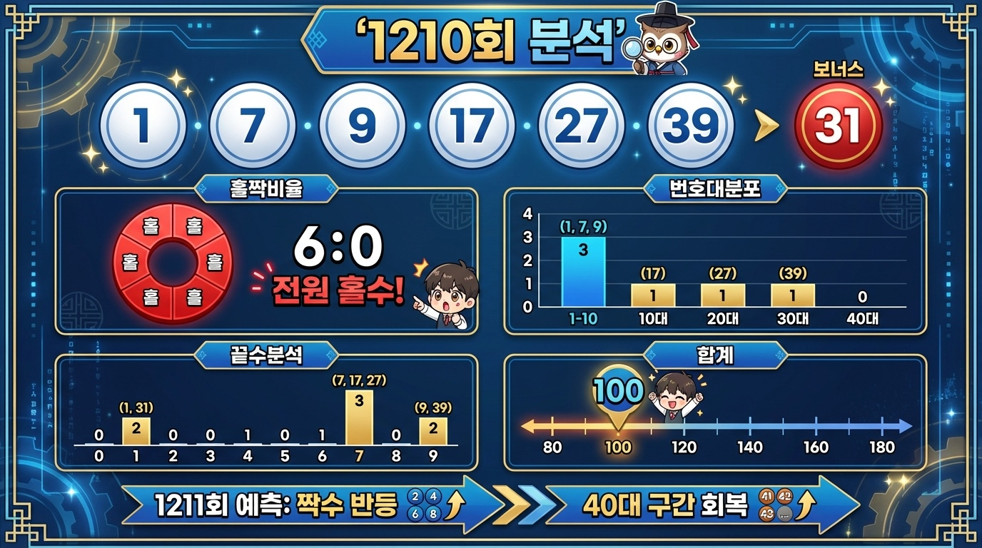 지난 1210회 로또는 2026년 2월 7일에 추첨되었으며 당첨번호는 1, 7, 9, 17, 27, 39이고 보너스번호는 31이었습니다. 이번 회차의 특징을 살펴보면 홀수가 6개, 짝수가 0개로 올홀수 조합이 나왔습니다. 😮