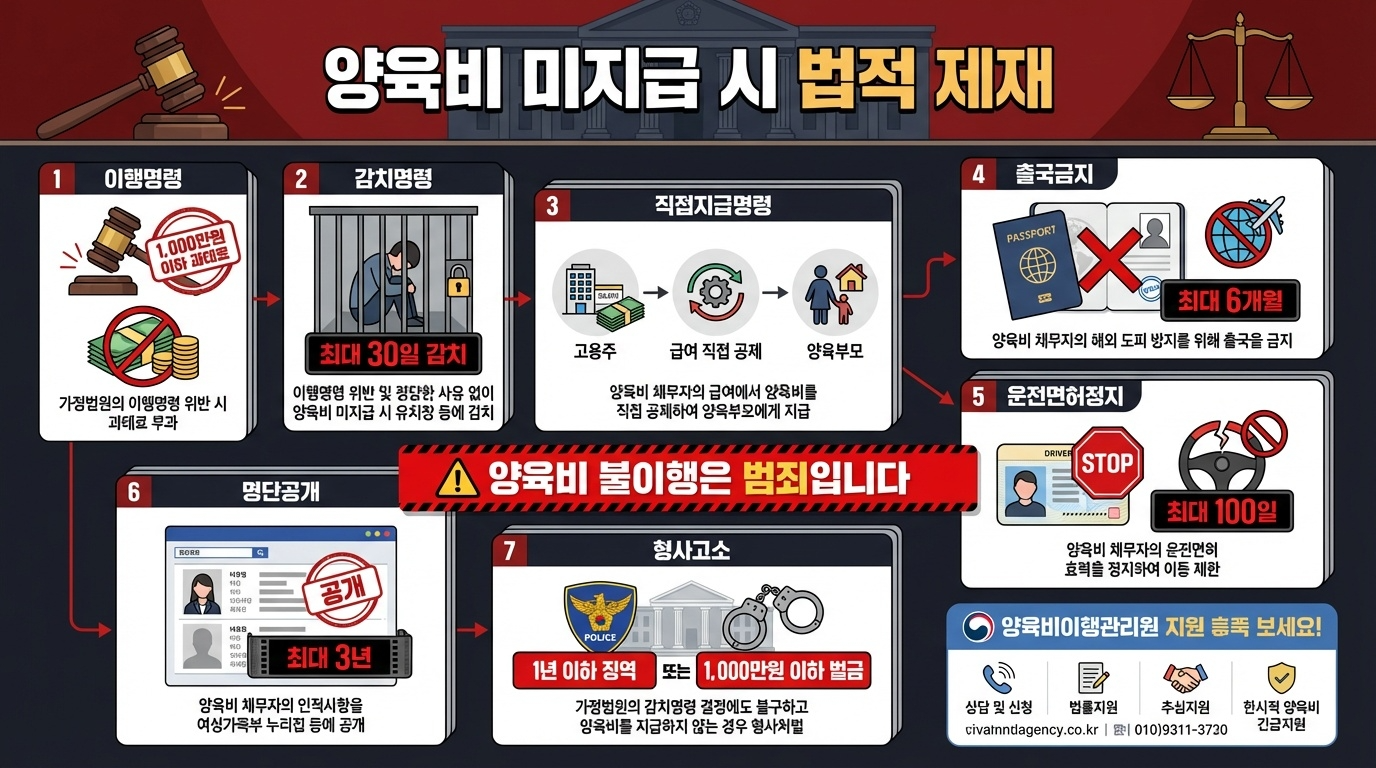 이행명령 위반 시 최대 1천만 원 과태료, 감치명령에 따른 최대 30일 구금, 출국금지, 운전면허 정지, 명단 공개, 형사 고소 시 1년 이하 징역 또는 1천만 원 이하 벌금 등의 제재를 받을 수 있습니다.