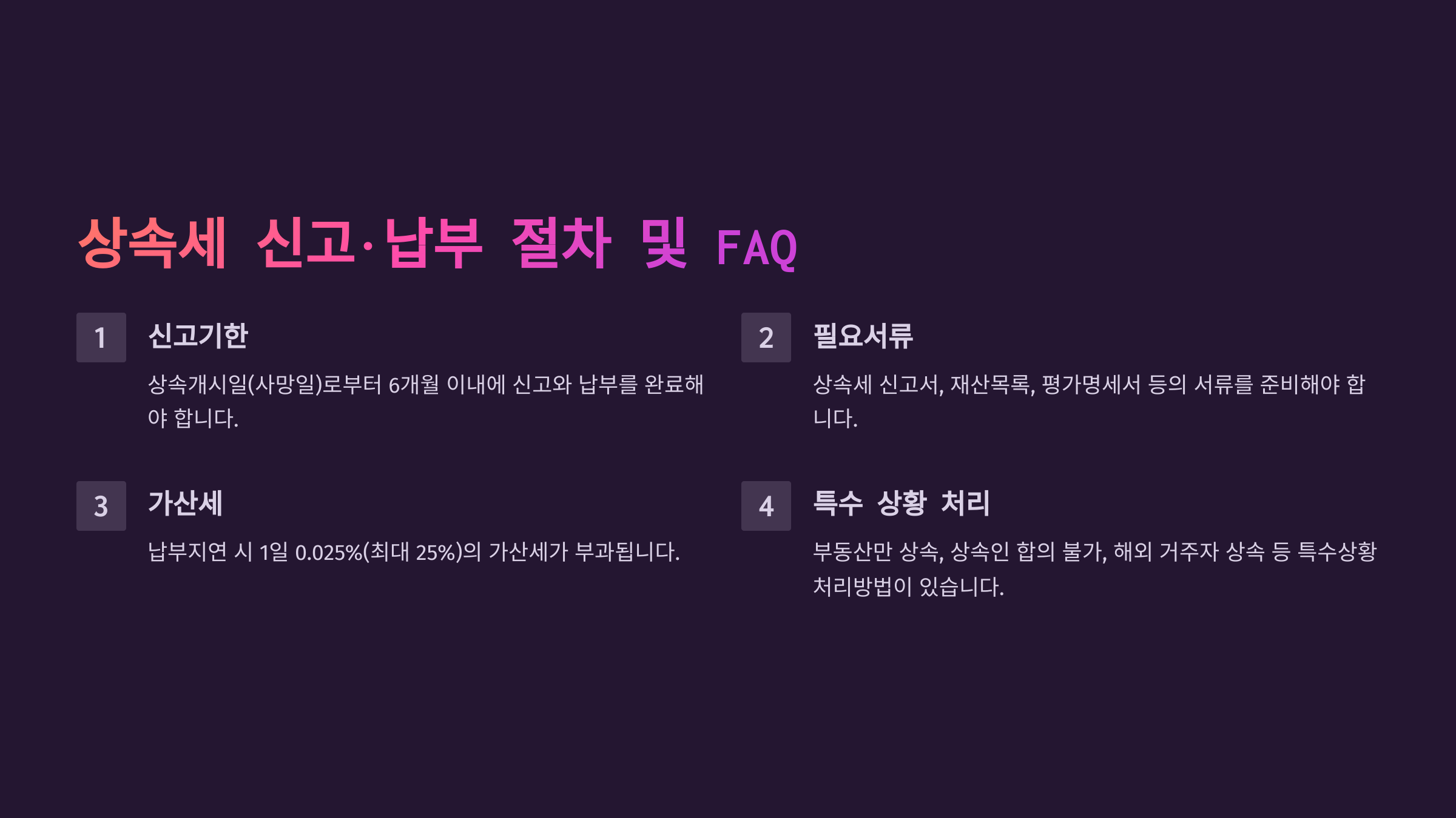 이번 글에서는 상속재산의 범위부터 시작해서 과세가액 계산, 공제항목, 세율적용, 납부방법까지 아주 꼼꼼하게 정리해봤어요. 상속이 발생했거나 대비하고 있는 분들에게 실질적인 도움이 되면 좋겠어요.