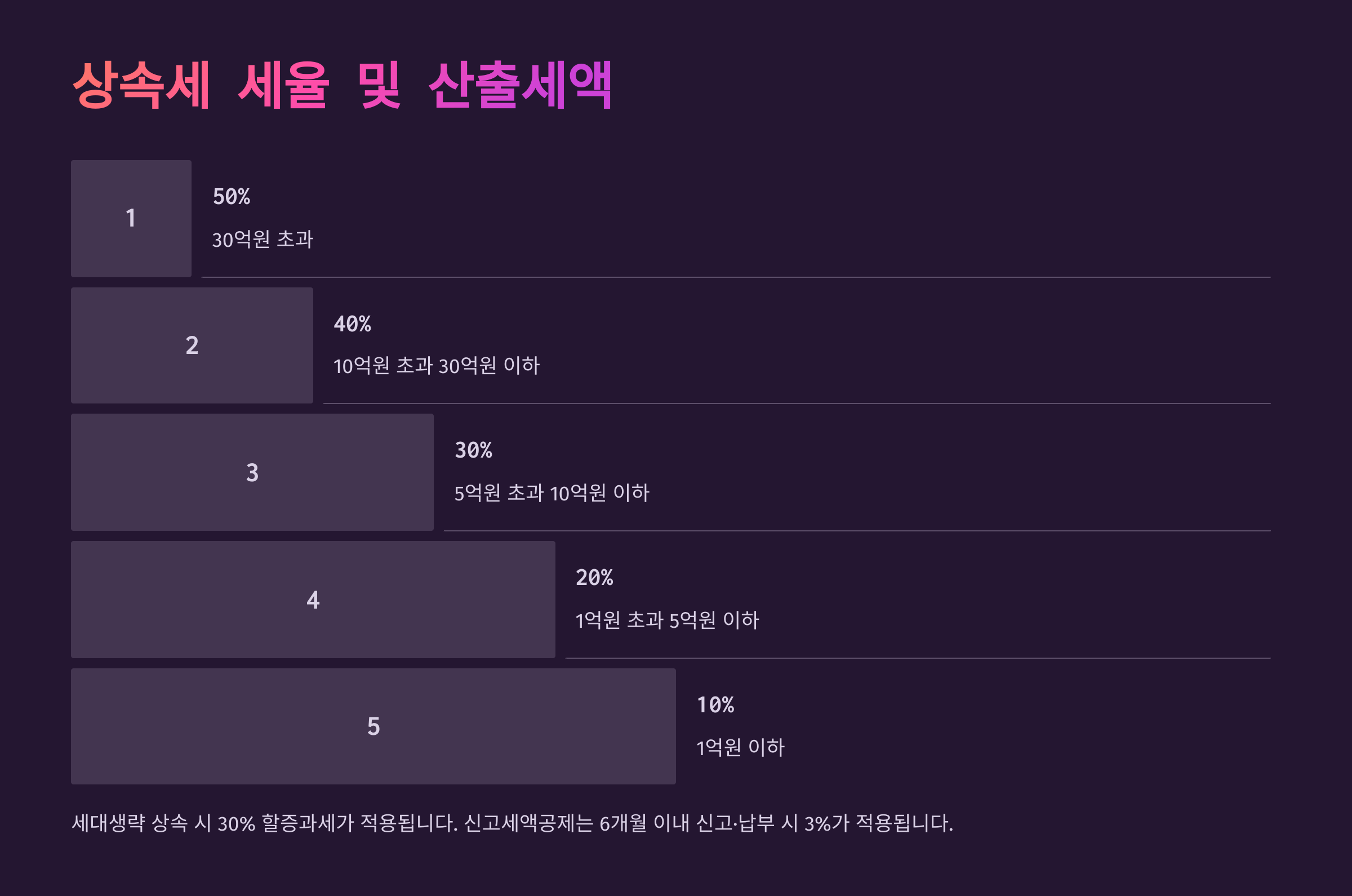 과세표준이 1억 원 이하일 경우에는 10%로 시작되며, 30억 원을 넘기면 최고세율인 50%가 적용돼요. 세율 구간이 5단계로 나뉘기 때문에 세금 차이가 상당히 클 수 있어요.