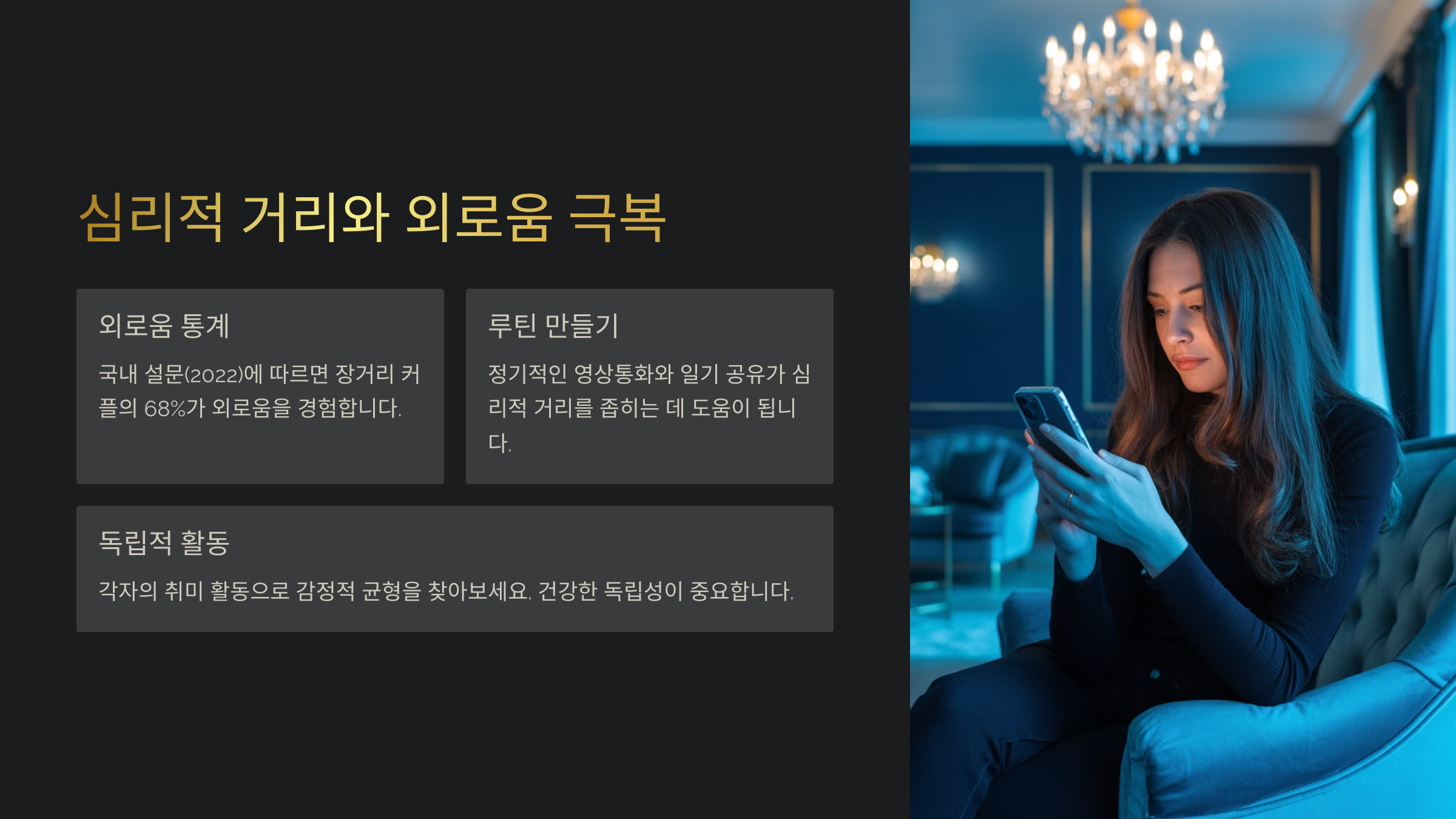 특히 심리적 거리를 좁히기 위해 ‘우리만의 정기 루틴’을 만드는 게 좋아요. 예를 들어 매주 금요일 밤은 영상 통화 데이, 매달 첫째 주엔 서로의 일상 사진 공유 등 작지만 소중한 습관들이 쌓이면 감정도 안정돼요.