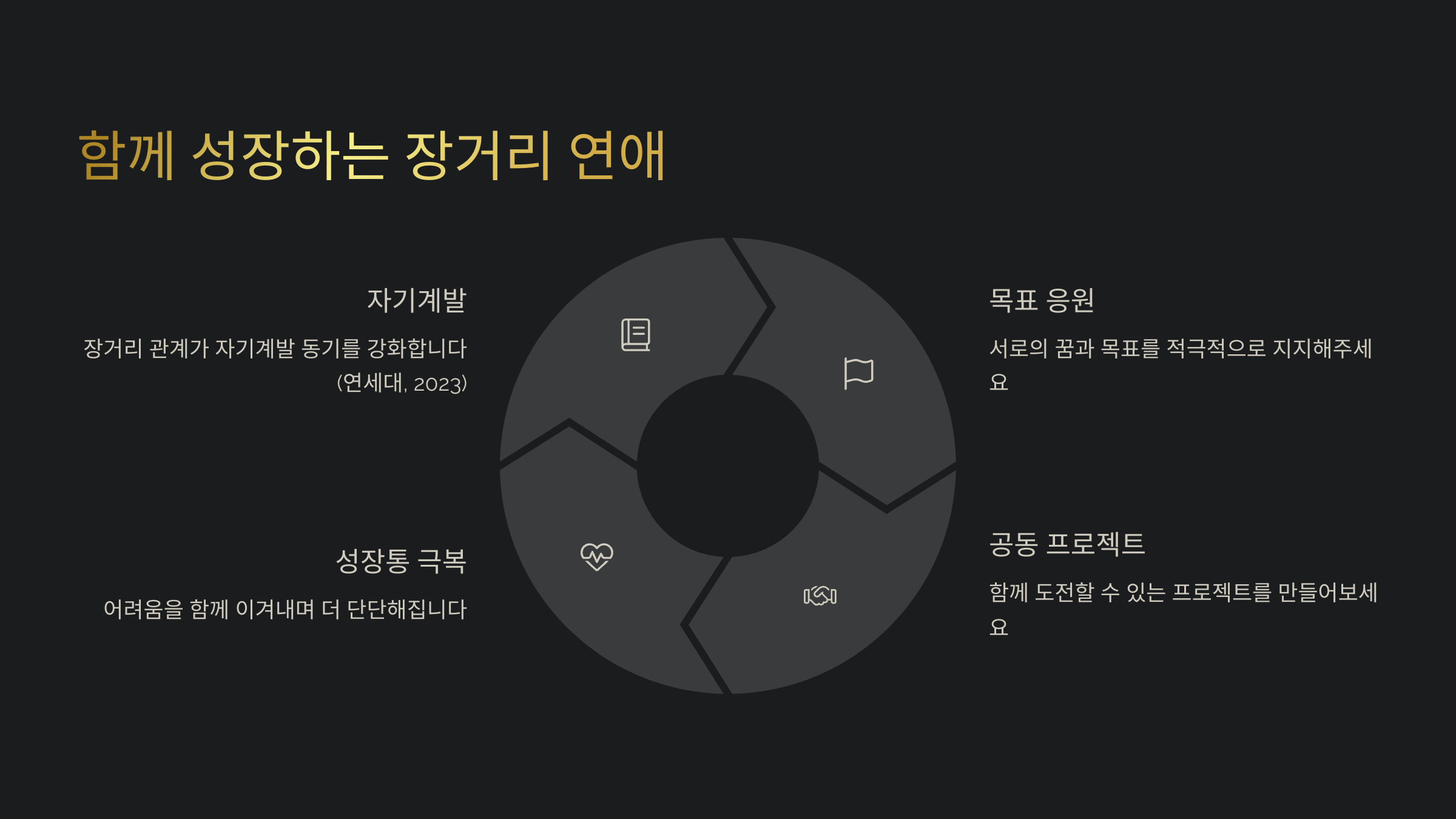 | 장기 미래 설계 | 같은 도시 취업 혹은 유학 | 서로의 커리어 존중하기 |