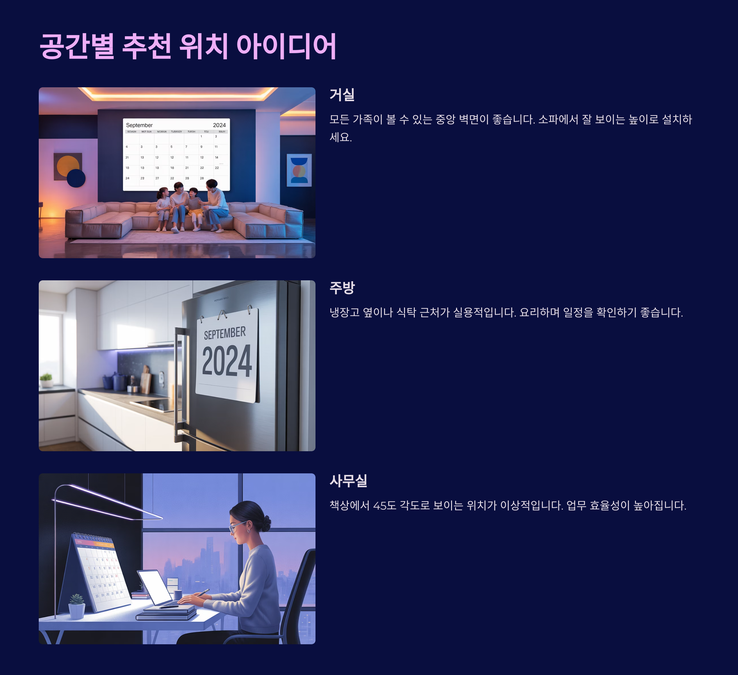| 주방 | 냉장고 옆, 식탁 옆 | 가정 일정 관리에 효과적 |