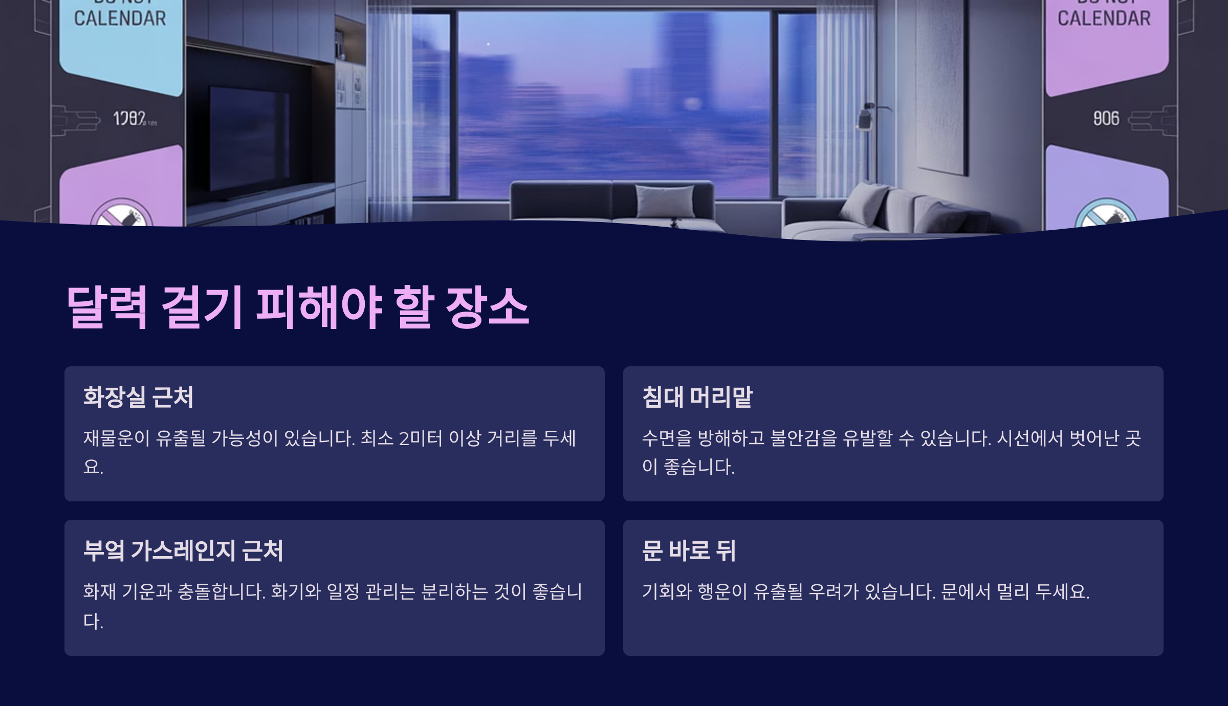 다음은 달력을 걸기 피해야 할 장소와 그 이유에 대해 설명드릴게요. 공간마다 기운이 다르기 때문에, 그에 맞는 위치 선정이 중요합니다 🚫