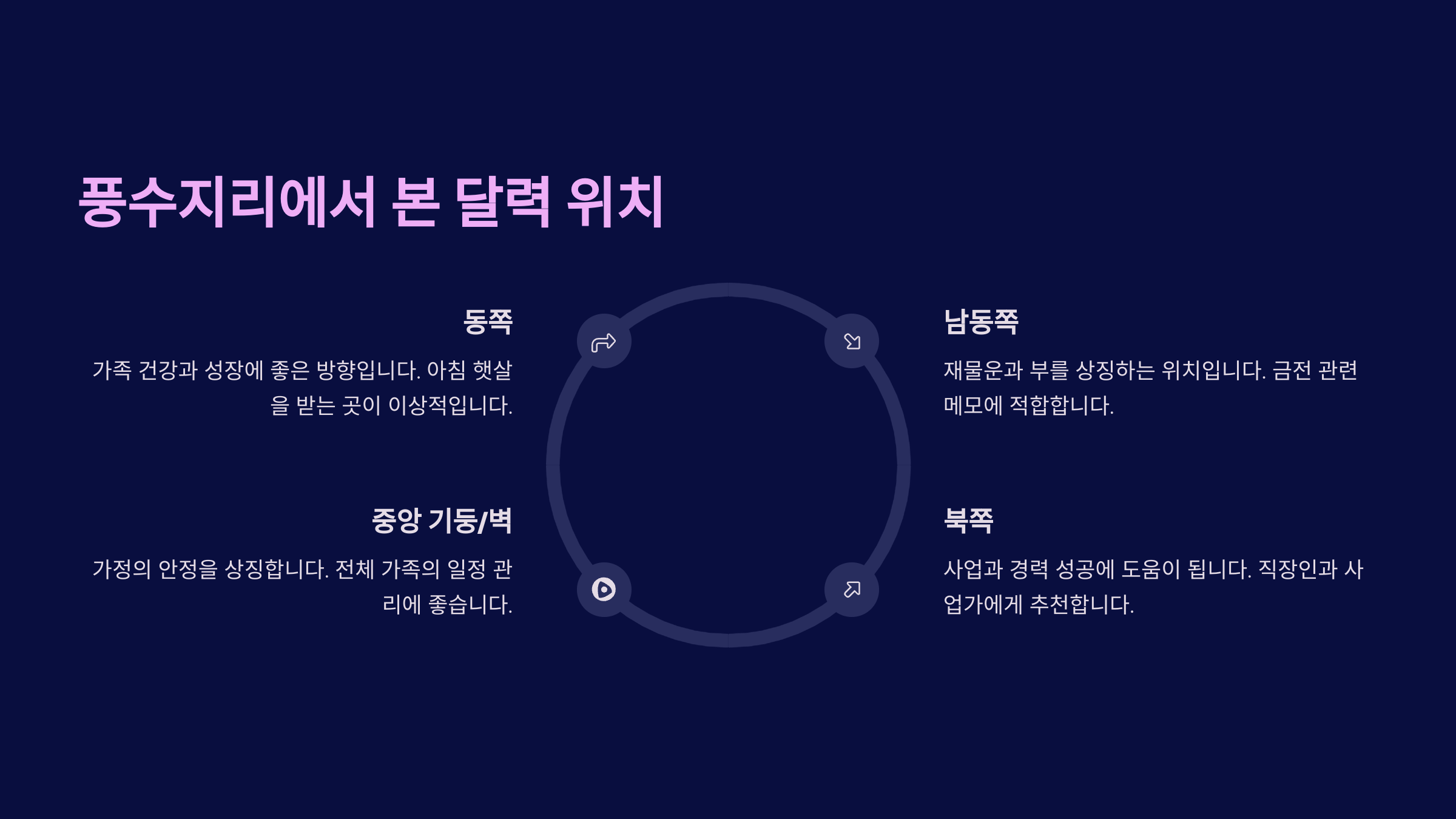 | 거실 | 북동·서남 벽 | 가족의 조화, 공동 일정 관리 |