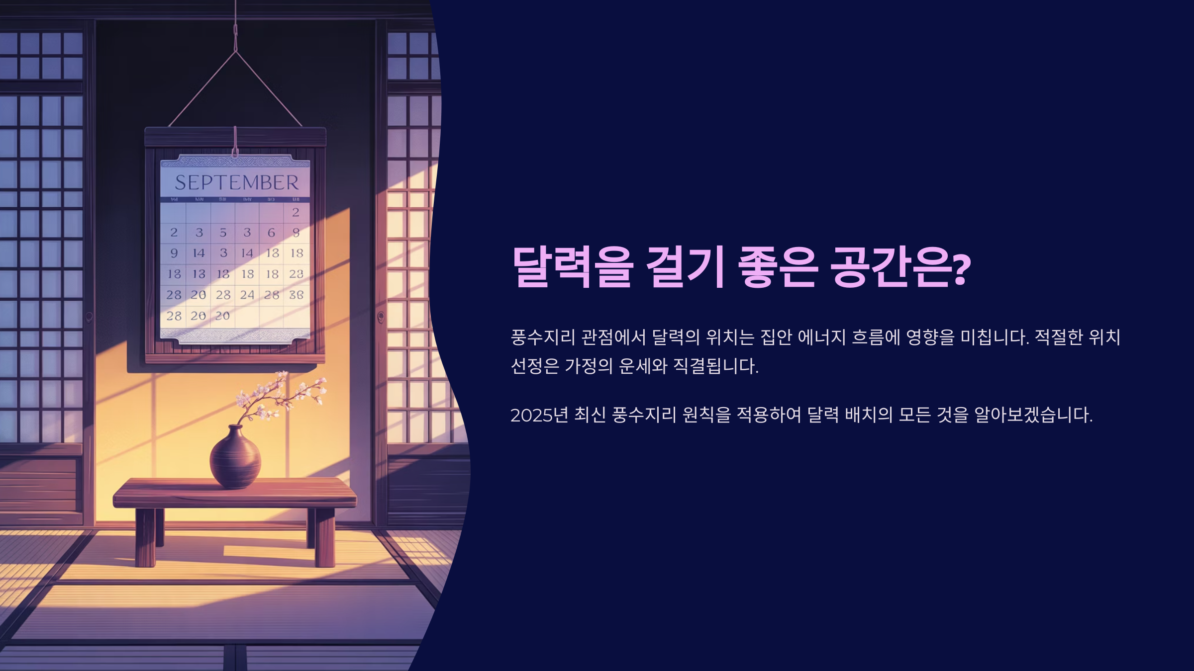 있습니다. 특히 풍수지리에서는 ‘시간을 상징하는 달력’이 공간의 기운과 상충하지 않도록 조심스럽게 다루는 편입니다.