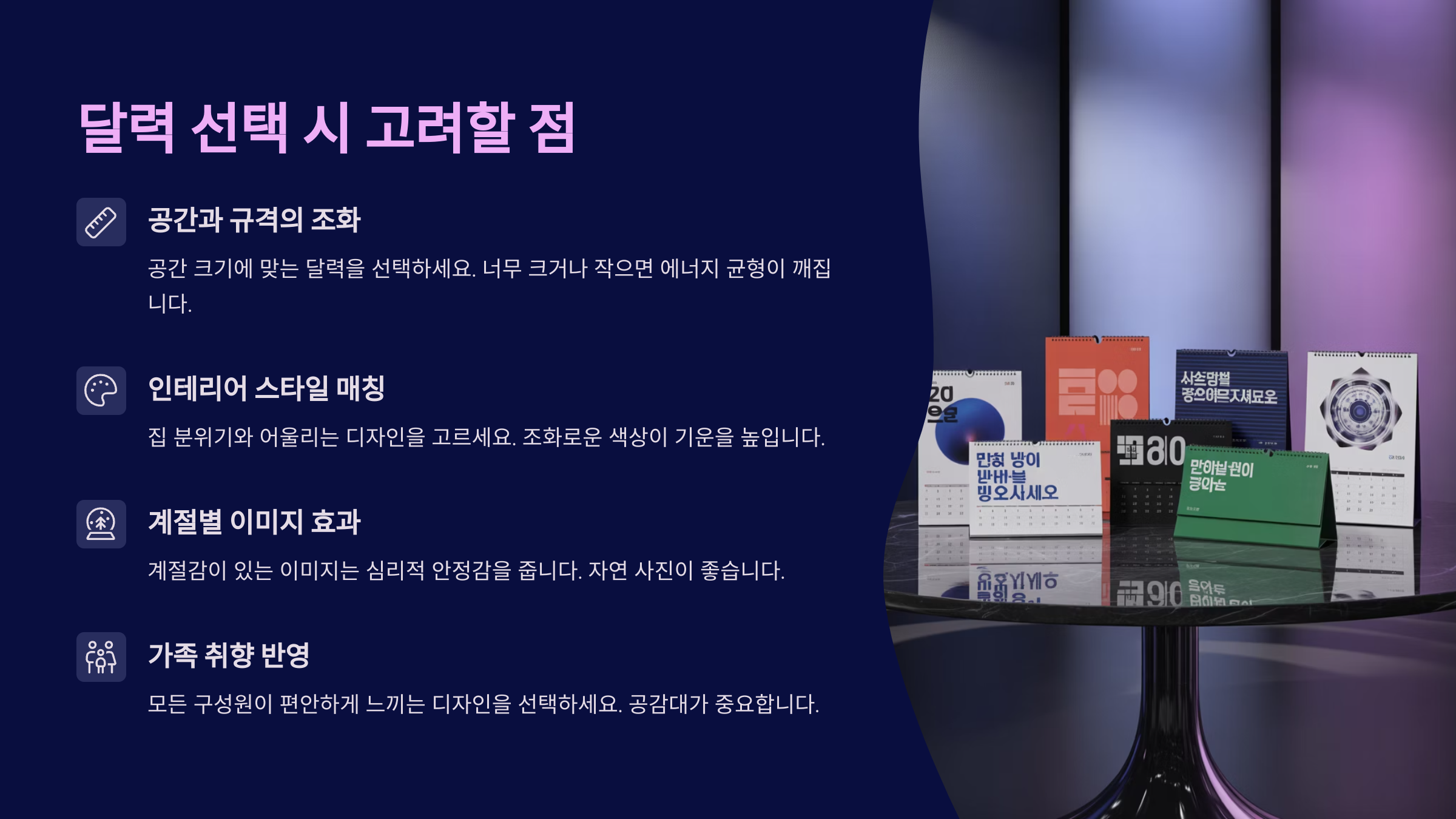 달력은 매일 보게 되는 생활 소품인 만큼 단순히 예쁜 디자인만 보는 것이 아니라 용도와 공간에 맞는 제품을 선택하는 것이 중요합니다. 집안의 분위기, 배치 위치, 사용하는 사람의 성향 등을 고려하면 더 오랫동안 유용하게 사용할 수 있습니다.