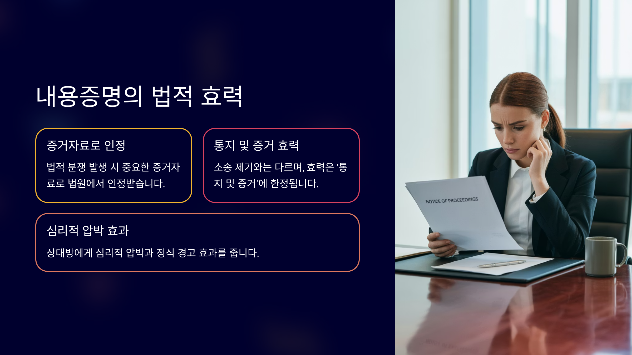 내용증명은 단순히 ‘내용이 발송되었다’는 사실만을 증명해줄 뿐, 그 내용이 진실이라는 법적 추정은 하지 않아요. 하지만 ‘그 시점에 그 내용을 송달했다’는 사실은 소송 등에서 매우 중요한 증거가 돼요. ⚖️