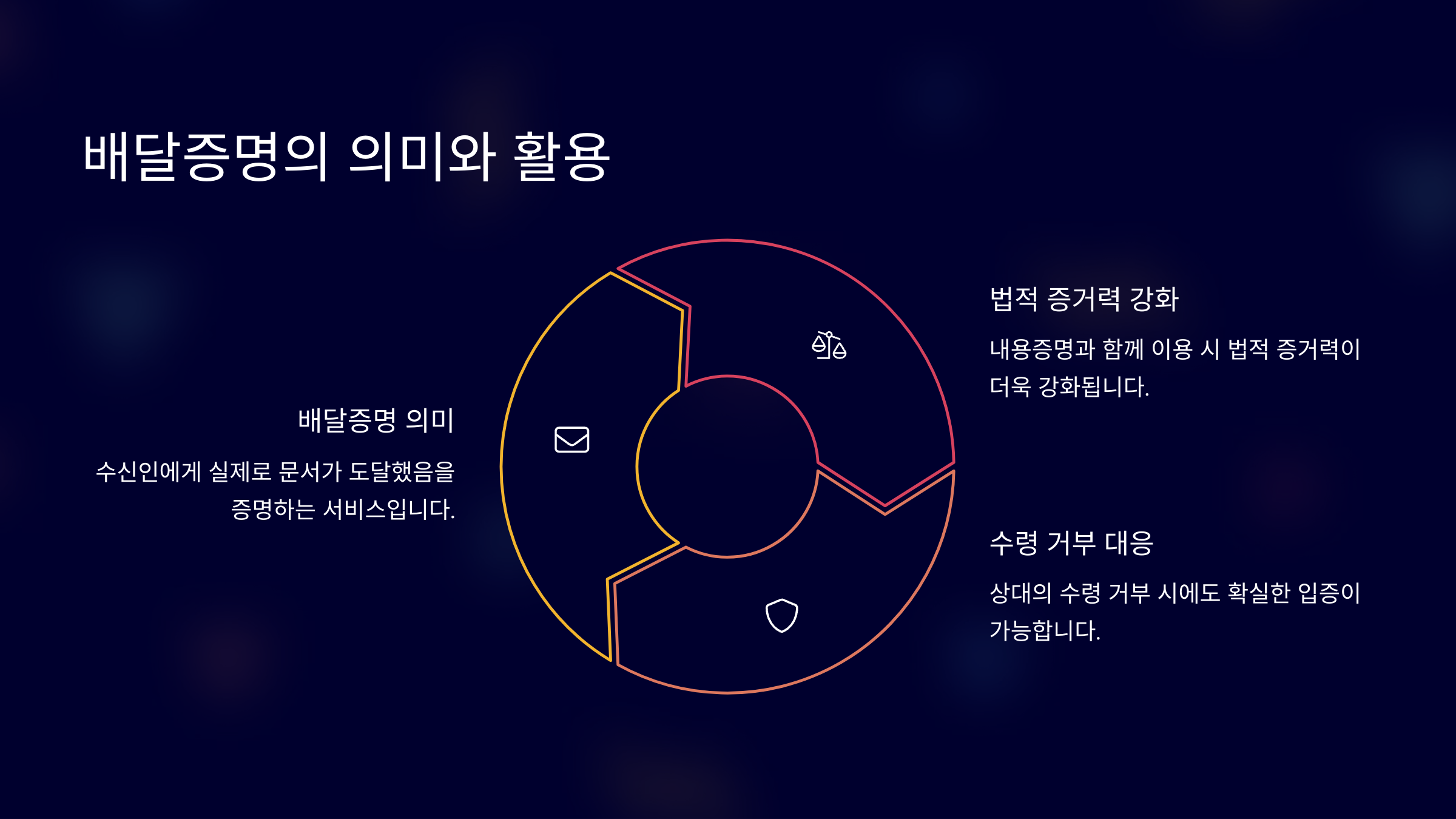 배달증명은 등기취급을 전제로 하며, 별도 표시 없이도 내용증명 발송 시 함께 신청할 수 있어요. 수취인에게 문서가 전달된 후, 우체국은 발송인에게 ‘배달일시’와 ‘수취인 정보’를 담은 배달증명서를 우편 또는 전자파일로 보내줘요.