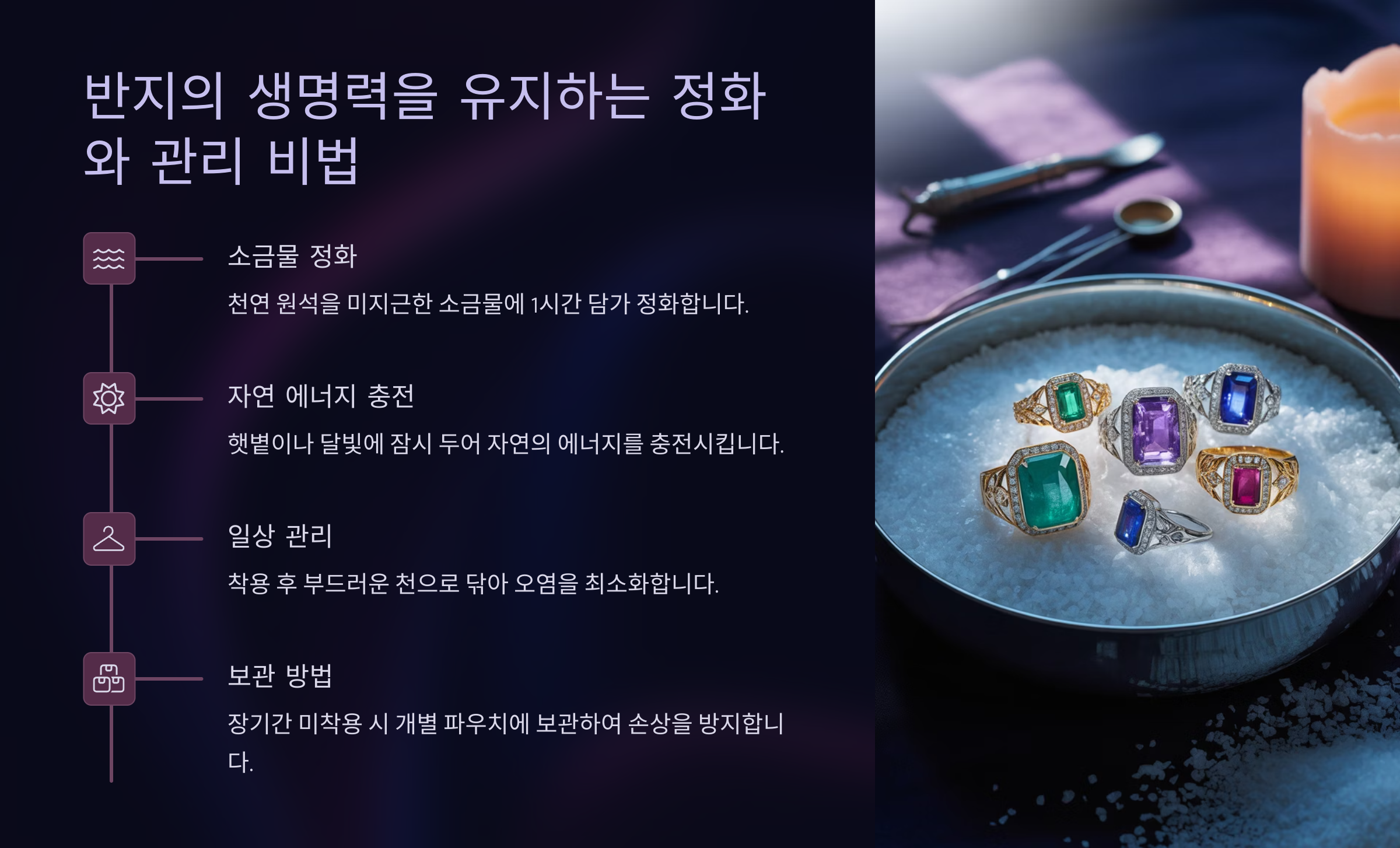 다섯째, 수정 클러스터 위에 놓기</strong. 수정은 모든 원석의 에너지를 회복시키는 정화 스톤이에요. 깨끗한 수정 클러스터 위에 반지를 올려두면 하루 정도 지나면서 기운이 맑아져요.