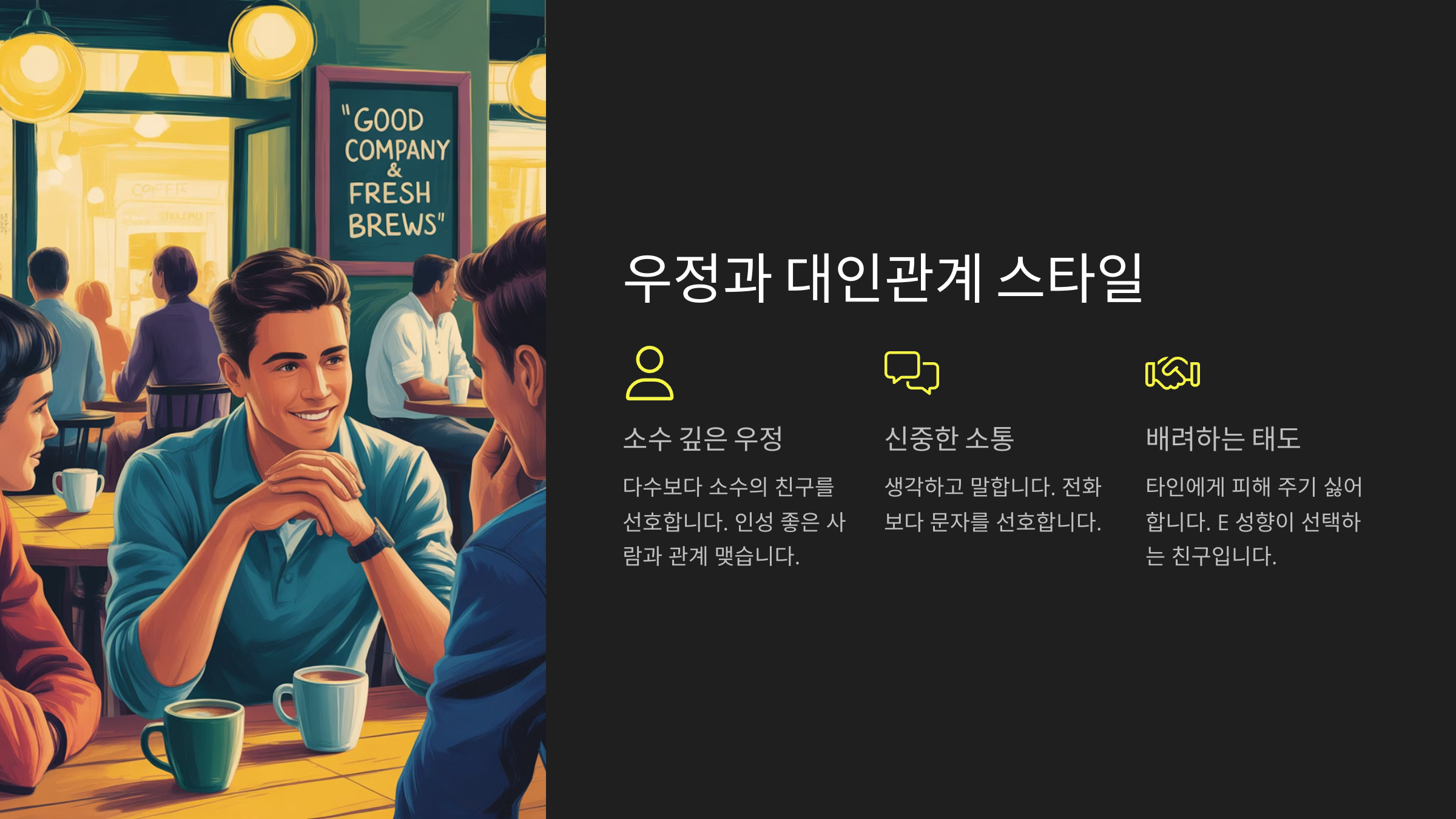 | 신중한 친화력 | 시간이 지나야 가까워짐 | 깊은 우정 형성 |