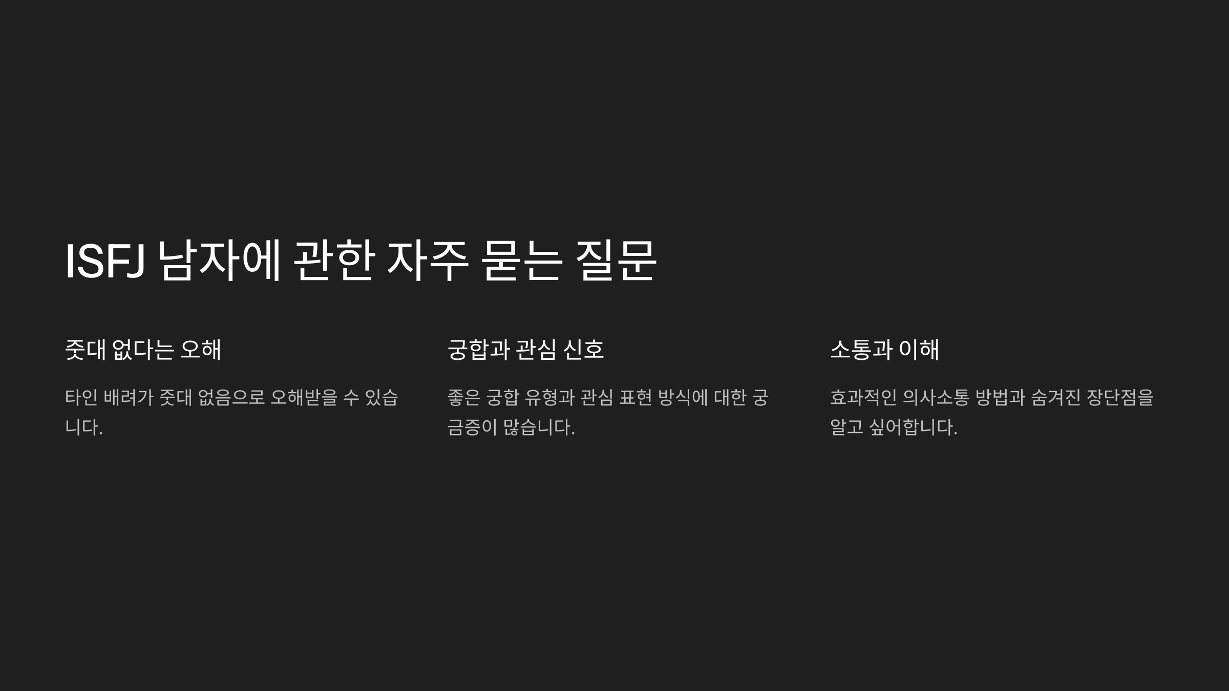 겉으론 차분하고 조용해 보일 수 있지만, 알고 보면 정서적으로 굉장히 따뜻하고 깊은 면이 많아요. ‘내 사람’이라고 생각되면 끝까지 책임지는 그런 듬직한 매력이 있답니다. 저도 주변에서 ISFJ 남자들을 많이 봤는데, 참 믿음직하고 마음이 따뜻한 사람들이었어요.
